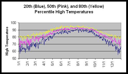 Variability increases over the same period. For example, on January 1, 20% of the time the high temperature is 60 or below, and only 20% of the time is it 80 or over. Sixty percent of the time highs range from 60 to 80.