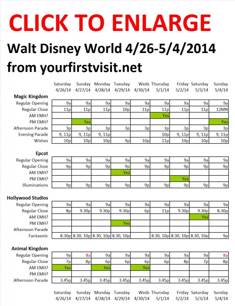 OPERATING HOURS AT WALT DISNEY WORLD 4/26-5/4/2014
