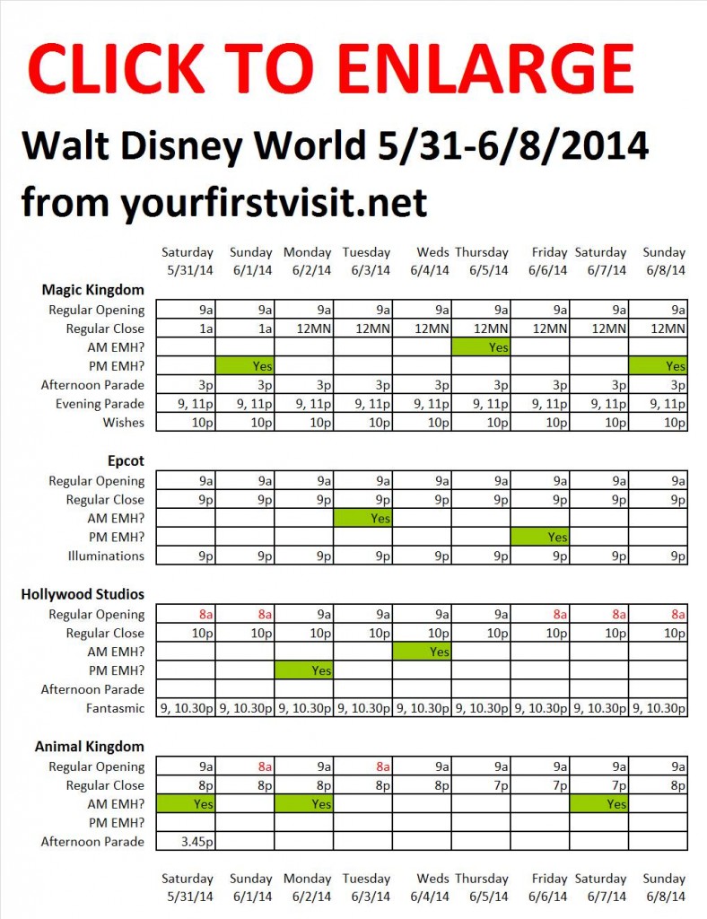 OPERATING HOURS AT WALT DISNEY WORLD 5/31-6/8/2014