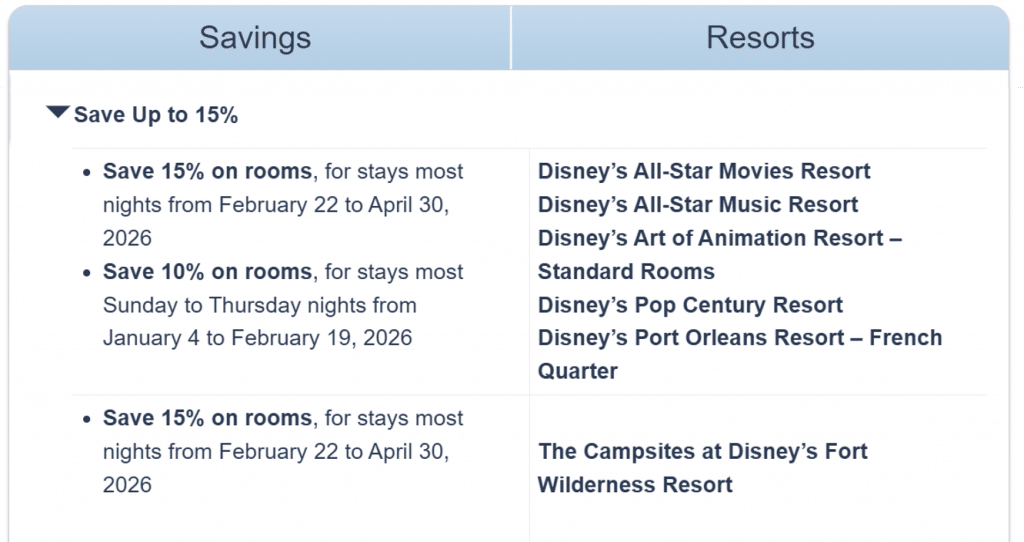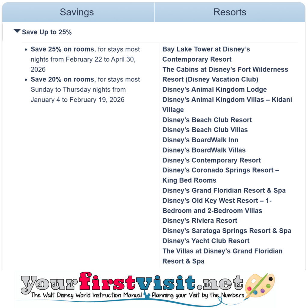 Walt Disney World has released a room rate deal offering savings off hotel list prices of 10% to 25%.