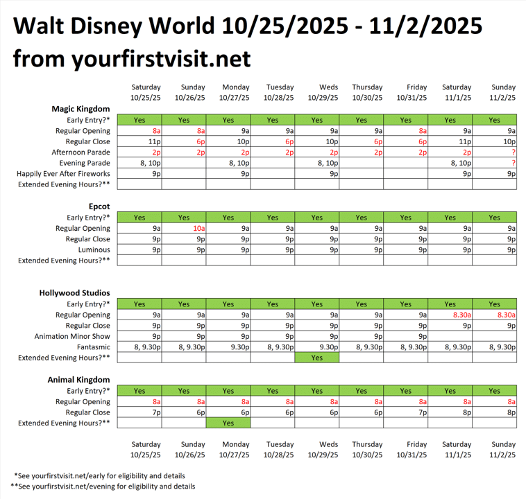 OPERATING HOURS AT WALT DISNEY WORLD 10/25/25 – 11/2/25