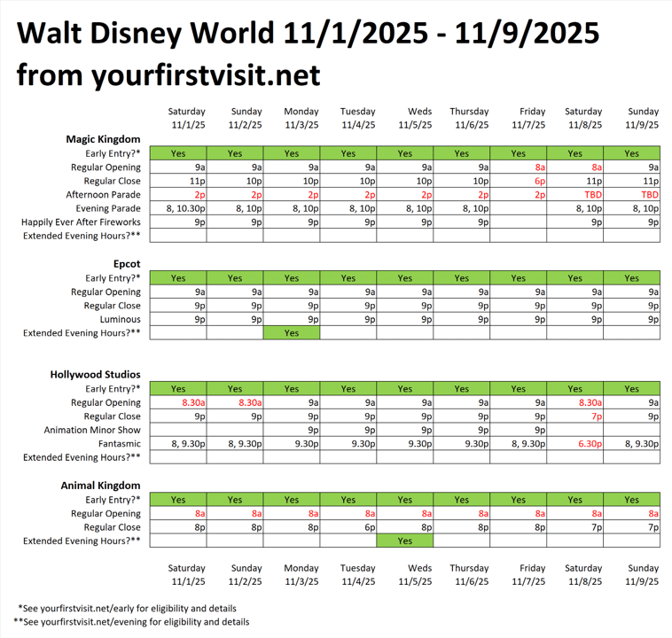 OPERATING HOURS AT WALT DISNEY WORLD 11/1/25 – 11/9/25