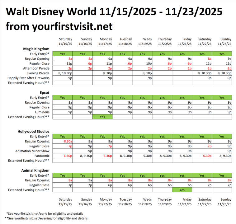 OPERATING HOURS AT WALT DISNEY WORLD 11/15/25 – 11/23/25