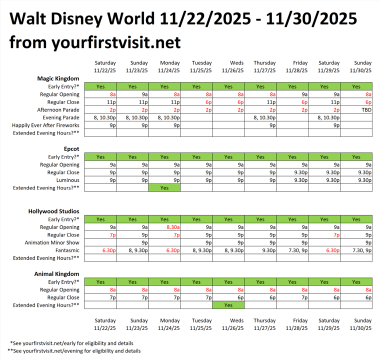 OPERATING HOURS AT WALT DISNEY WORLD 11/22/25 – 11/30/25