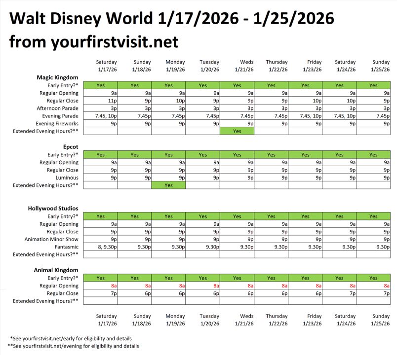 OPERATING HOURS AT WALT DISNEY WORLD 1/17/26 – 1/25/26