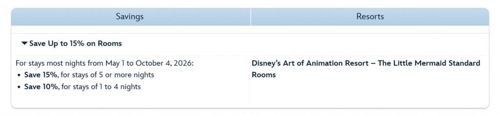Lowest savings are for Little Mermaid rooms at Art of Animation.