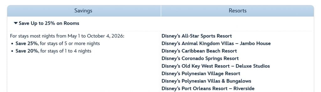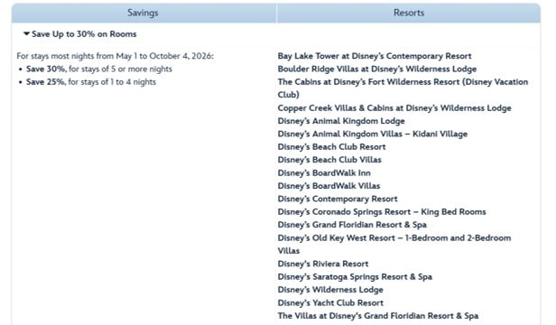 Walt Disney World has released a room rate deal for “most nights” May 1 through October 4 offering savings off hotel list prices of 10% to 30%.