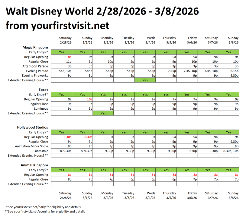 OPERATING HOURS AT WALT DISNEY WORLD 2/28/26 – 3/8/26