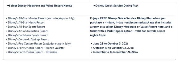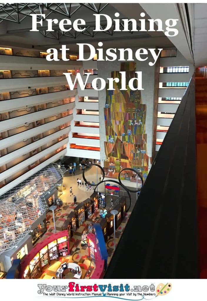 “Free Dining” means that guests with the deal staying in an eligible DVC or deluxe room get the Disney Dining plan for their stay for free, and guests staying in a value or moderate resort get the Disney Quick-Service Dining Plan for free.