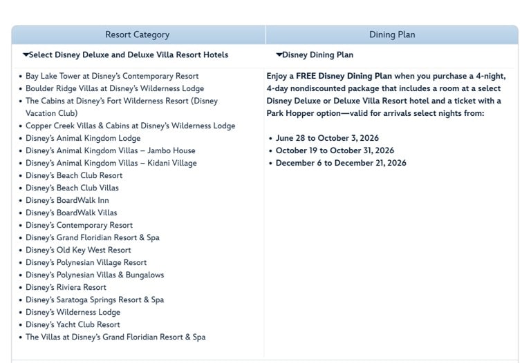 DISNEY WORLD FREE DINING DEAL FOR MANY DATES LATE JUNE THROUGH MID-DECEMBER 2026