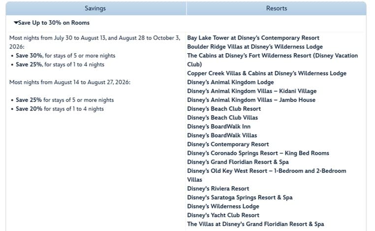 Walt Disney World has released a room rate deal for “most nights” July 30 through October 3 offering savings off hotel list prices of 10% to 30%.