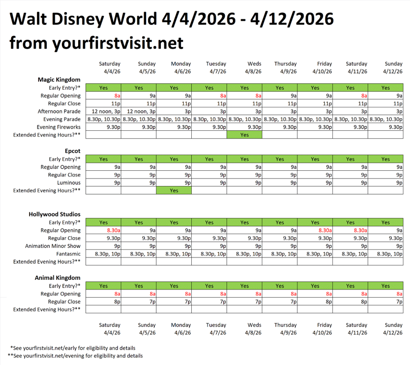 OPERATING HOURS AT WALT DISNEY WORLD 4/4/26 – 4/12/26