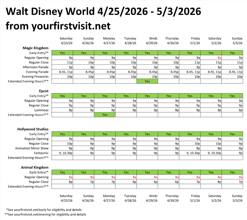 OPERATING HOURS AT WALT DISNEY WORLD 4/25/26 – 5/3/26