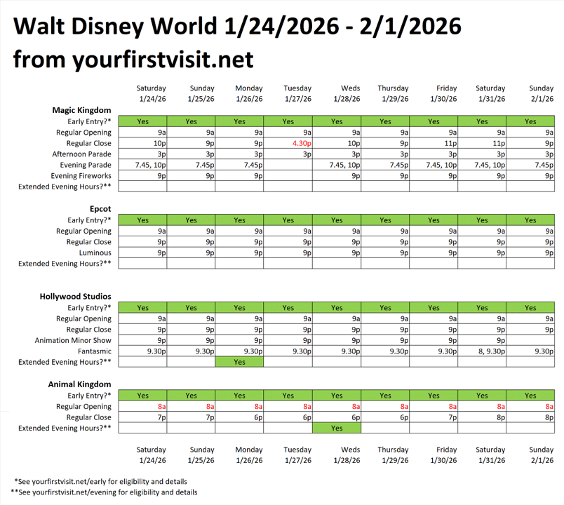 OPERATING HOURS AT WALT DISNEY WORLD 1/24/26 – 2/1/26