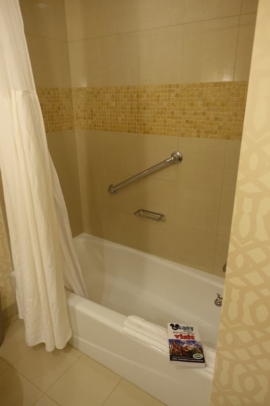 Among the five Hilton flagged properties at Disney World with access to Disney World’s Early Entry program, for families I would rank it second, after the Hilton Buena Vista Palace, which offers balconies and a divided bath.