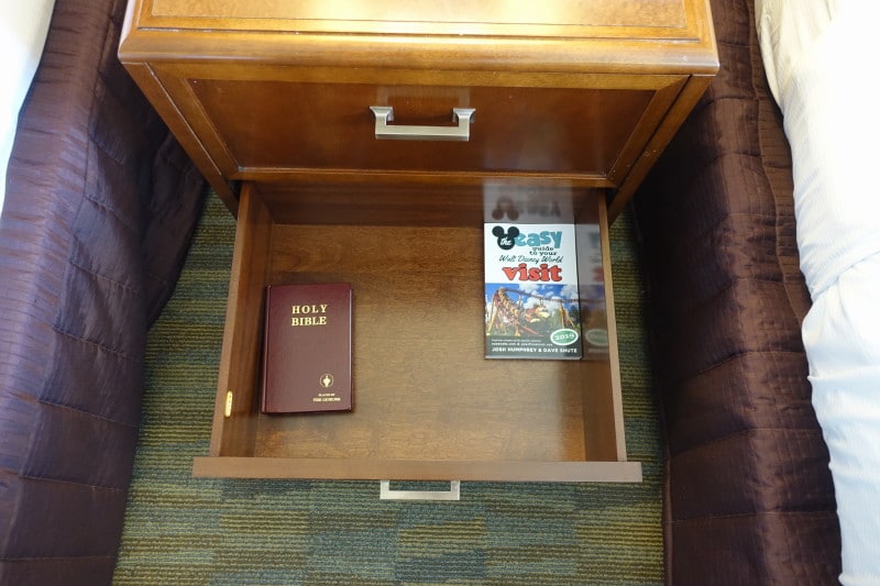 Between the beds you’ll find this bedside table, with what appears to be two drawers.