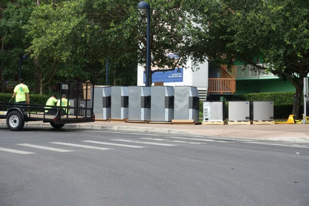 Being unloaded outside are what appear to be new ice-makers and/or Coke freestyle machines.