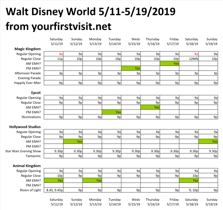 OPERATING HOURS AT WALT DISNEY WORLD 5/11-5/19/19
