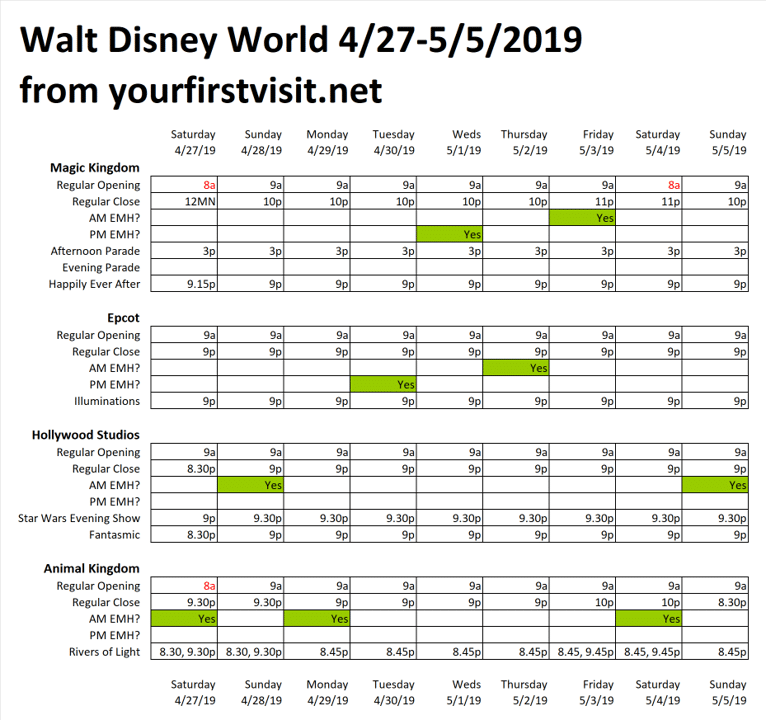 OPERATING HOURS AT WALT DISNEY WORLD 4/27-5/5/19
